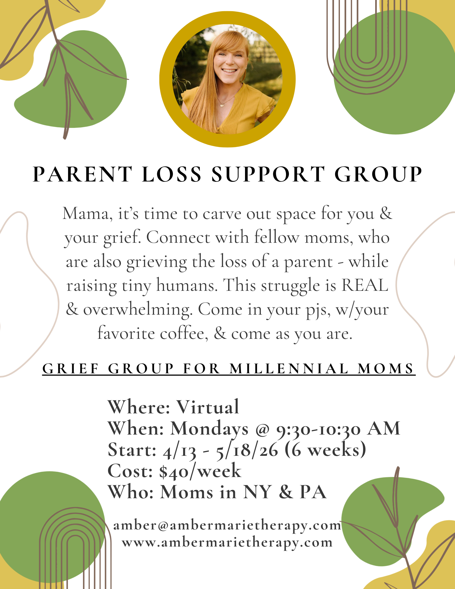ATTN MAMAS :: NEXT PARENT LOSS SUPPORT GROUP IS STARTING MONDAYS 4/13/26 @ 9:30AM! This virtual group is open to Moms in PA & NY, who are raising kids while also grieving the loss of their own parent. The group will run for 6 weeks, 4/13 - 5/18/26, every Monday from 9:30-10:30AM (perfect for right after getting the kids to school!). Virtual groups are open to all New York and Pennsylvania residents. Click below on 'Request Consultation' to sign up or want more information!